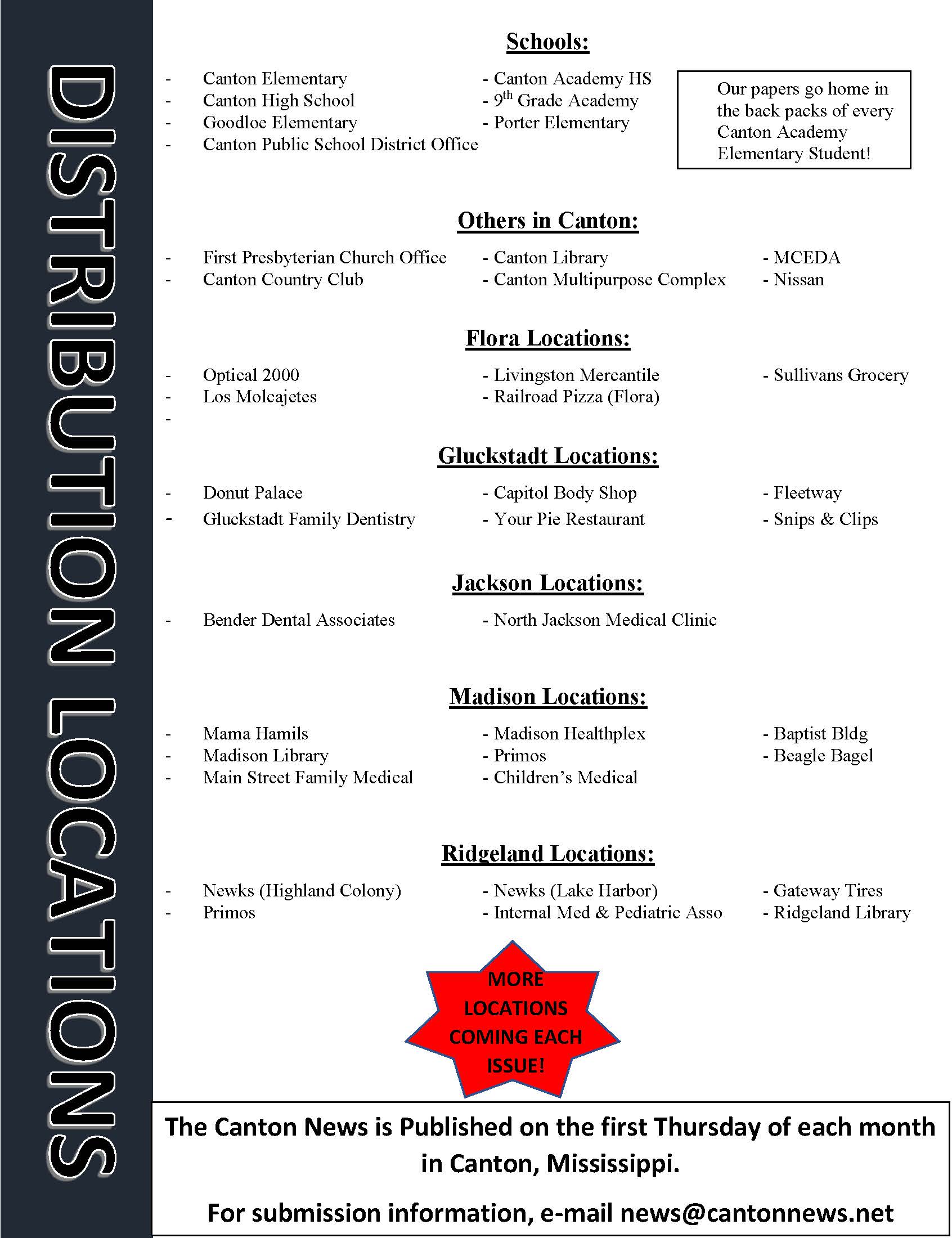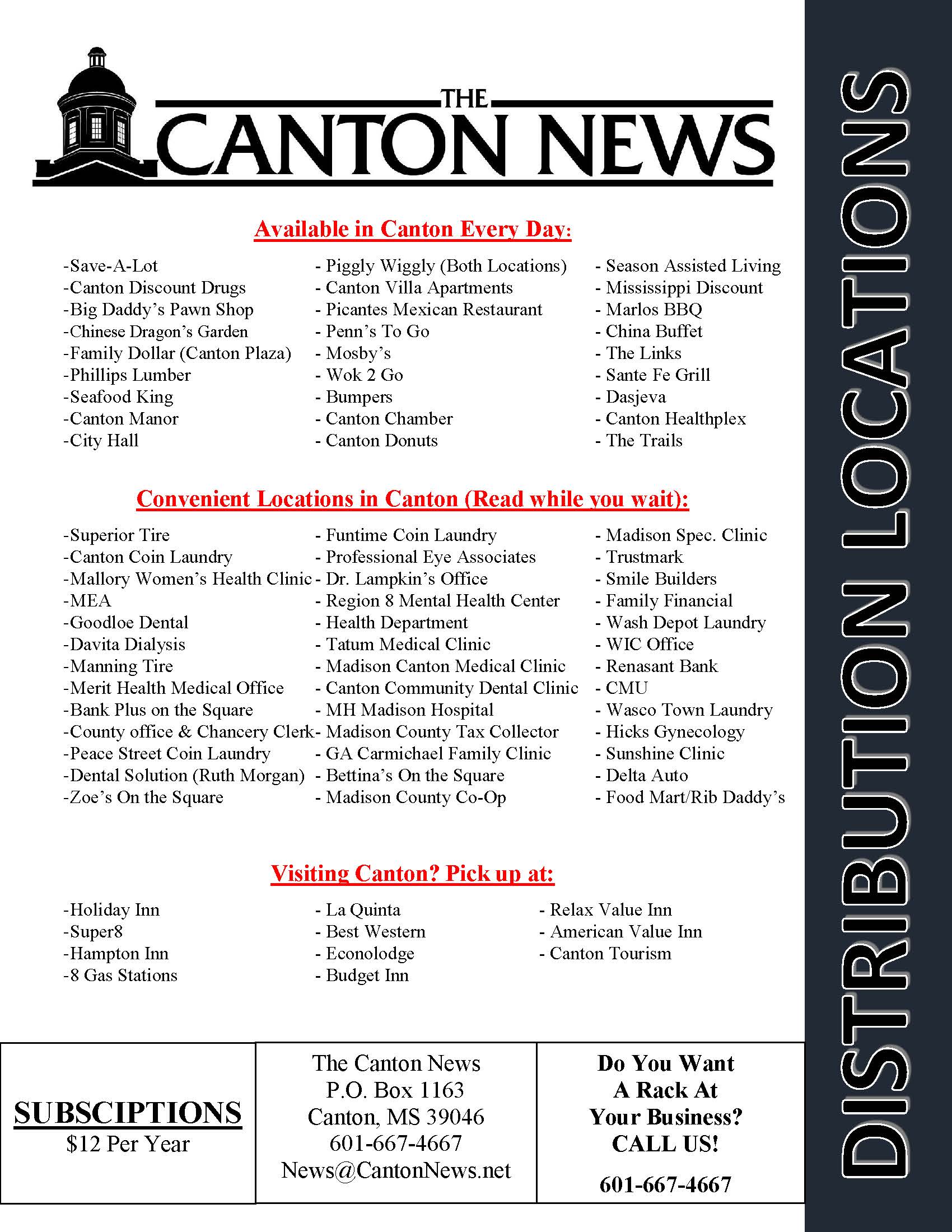 Canton News is a hyper-local community newspaper focusing on Canton Mississippi and the surrounding area (Madison County).  It is published once each month on the first Thursday of the month.  It is mailed for free to every business address in the 39046 zip code.  Subscriptions are $12 per year. The Canton News is also available for pick up from over 145 distribution locations in Canton, Gluckstadt, Flora, and Ridgeland.